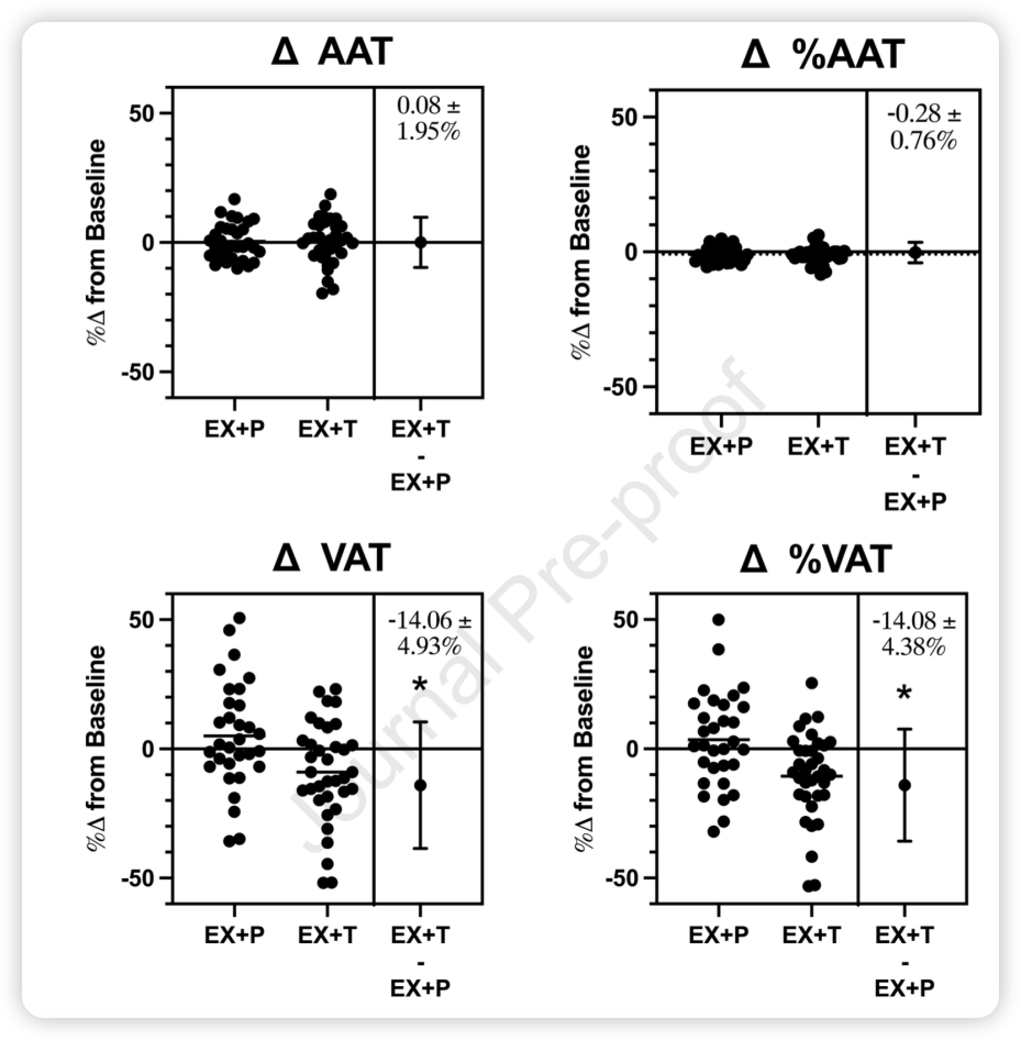 具体地看,两组的总脂肪量(TAT)均未显著减少,然而,EX+T组的相对内脏脂肪比例(%VAT)较基线显著降低10.57%,而安慰剂组反而上升3.51%,因此两组的差异高达14.08%(图2)。这意味着脂肪从高风险的“内脏仓库”向相对安全的皮下区域迁移。
