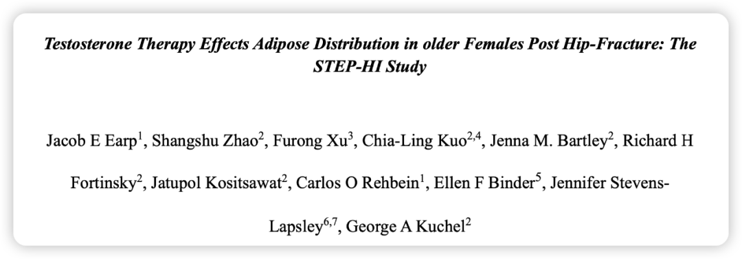 参考文献:Earp, J., Zhao, S., Xu, F., Fortinsky, R., Bartley, J., Kuo, C. L., & Kuchel, G. (2025). Testosterone Therapy Effects Adipose Distribution in Older Females Post Hip-Fracture: The STEP-HI Study. Innovation in Aging, 9(Suppl 2), igaf122.4021. https://doi.org/10.1093/geroni/igaf122.4021