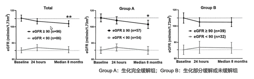 图4. SAAE治疗前后eGFR变化:基线肾功能与生化缓解状态对长期肾功能的影响
