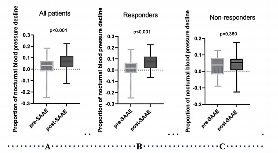 图7. SAAE治疗前后夜间血压下降比例变化,仅生化应答者组实现血压节律显著改善