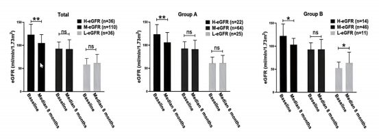 团队分析了182例接受SAAE治疗的患者,根据术前eGFR进行分组。总体来看,术后eGFR有轻度下降,但分层分析揭示了一个重要现象:eGFR的下降主要来源于术前存在肾小球超滤过(即eGFR高于预期正常值上限)的患者[4]。