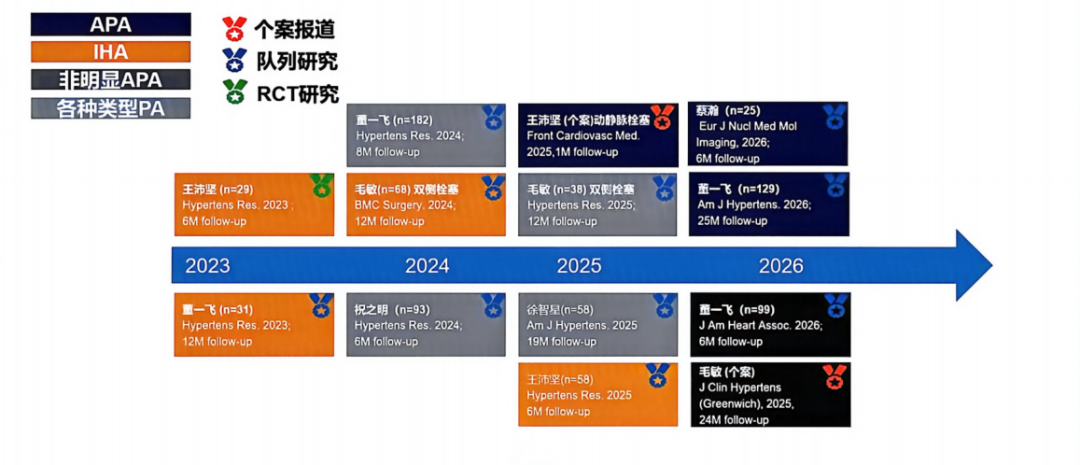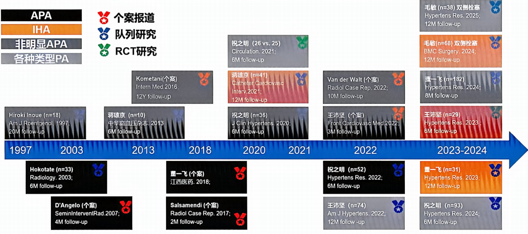 这项技术并非横空出世的“新概念”,而是一场跨越近30年的医学马拉松。从早期的个案报道,到队列研究,再到如今的随机对照试验,SAAE的证据链条正在日益完善。董一飞教授指出,回顾这30年的文献,SAAE几乎覆盖了PA的所有亚型——无论是单侧的APA,还是双侧的IHA,甚至是混合型病例,都有了相应的介入治疗探索。