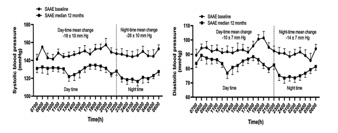 研究团队发现,接受SAAE治疗后,患者全天血压水平均显著下降,且夜间血压的下降幅度大于白天。这一现象对高血压高质量管理具有重要意义——夜间血压是心血管风险的独立预测因子[2]。