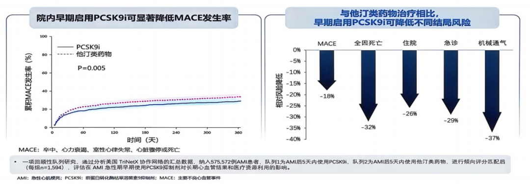 真实世界数据同样验证了院内早期启动的价值。一项基于TriNetX数据库、纳入575 572例急性心肌梗死(AMI)患者的研究显示,发病5天内早期启用PCSK9抑制剂,可显著降低卒中、心衰、恶性心律失常、心脏骤停及死亡等MACE风险(图10),并减少医疗资源消耗[13]。