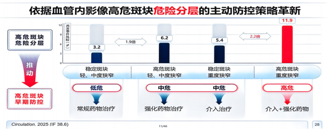 基于上述影像学特征,候教授团队2025年发表在《Circulation》杂志的一篇综述提出了基于OCT的高危斑块危险分层策略(图5)[7]。其中,“中危”人群——即高危斑块伴轻中度狭窄者——最易被临床忽略,是ACS再发事件的潜在高风险人群,亟需通过强化药物治疗实现斑块稳定,阻断急性事件链条。