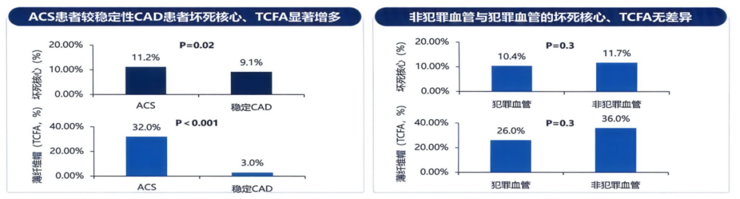 影像学研究揭示了再发风险升高的病理基础。ACS患者易损斑块(薄帽纤维粥样斑块,TCFA)比例高达32%,而稳定性冠心病患者仅为3%,相差十倍以上(图2)。更值得警惕的是,ACS患者非罪犯血管与罪犯血管的斑块组成高度相似——这意味着即使成功处理了罪犯病变,其他血管仍存在大量高危斑块,成为再发事件的潜在来源[3]。